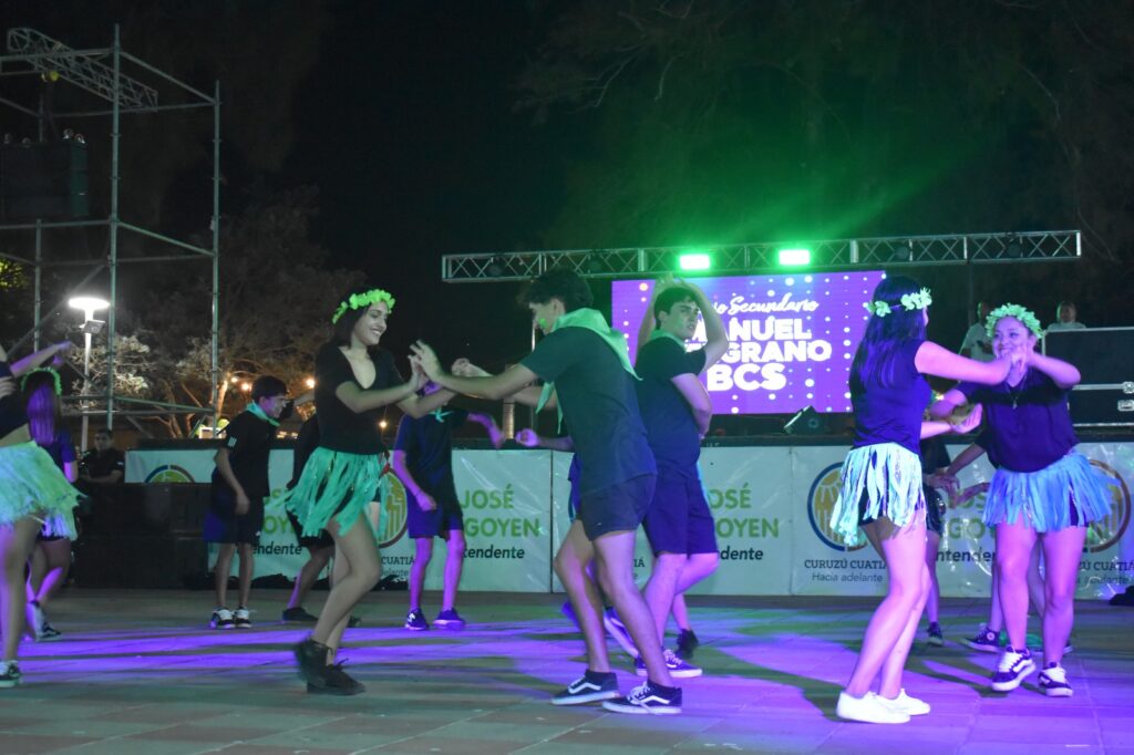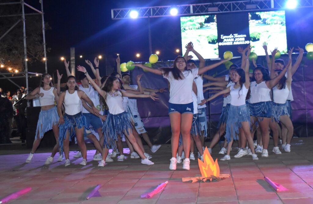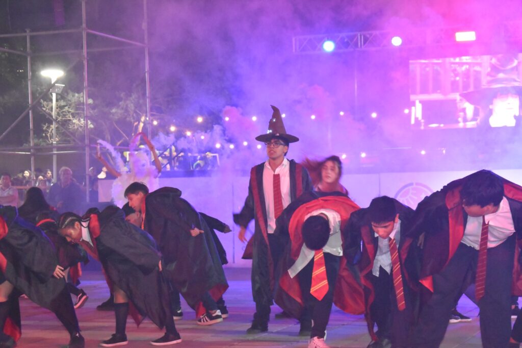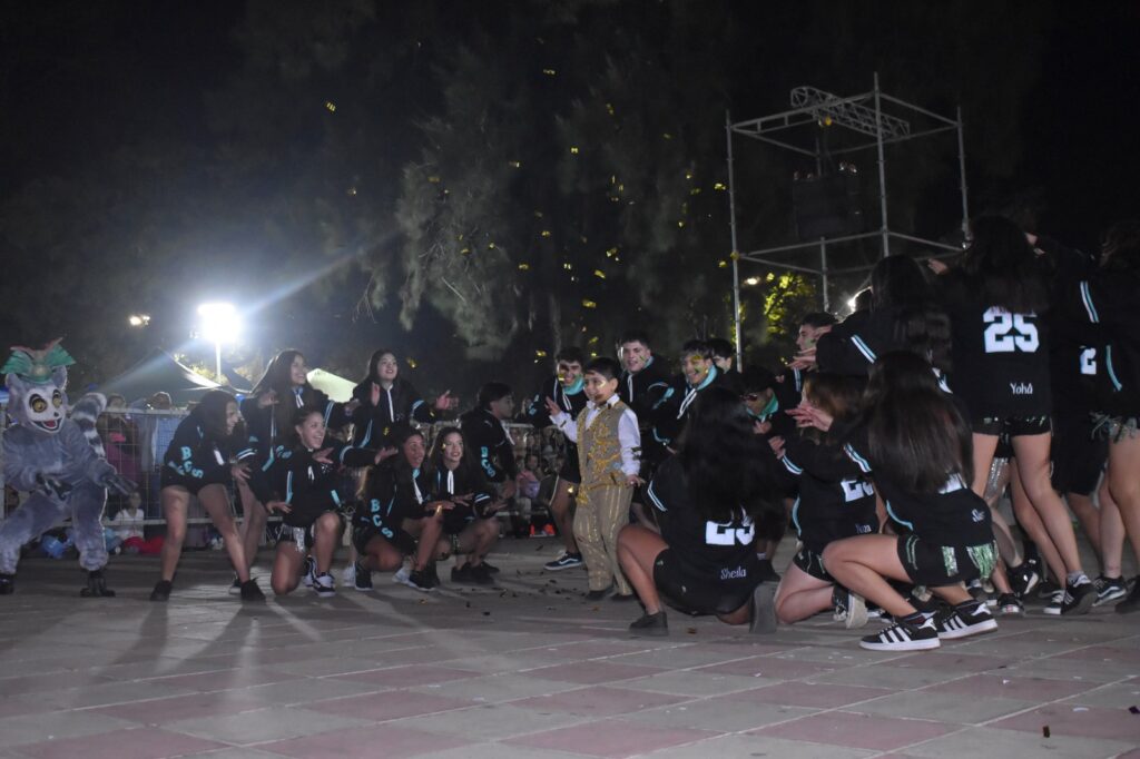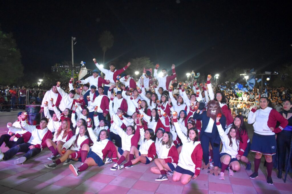 Los estudiantes de los distintos colegios secundarios de la ciudad fueron los grandes protagonistas de la noche, desplegando todo su ingenio y esfuerzo en espectaculares producciones artísticas. El público pudo disfrutar de complejas coreografías y creativos diseños de indumentaria y mascotas, evidenciando un crecimiento en el nivel del espectáculo año tras año.